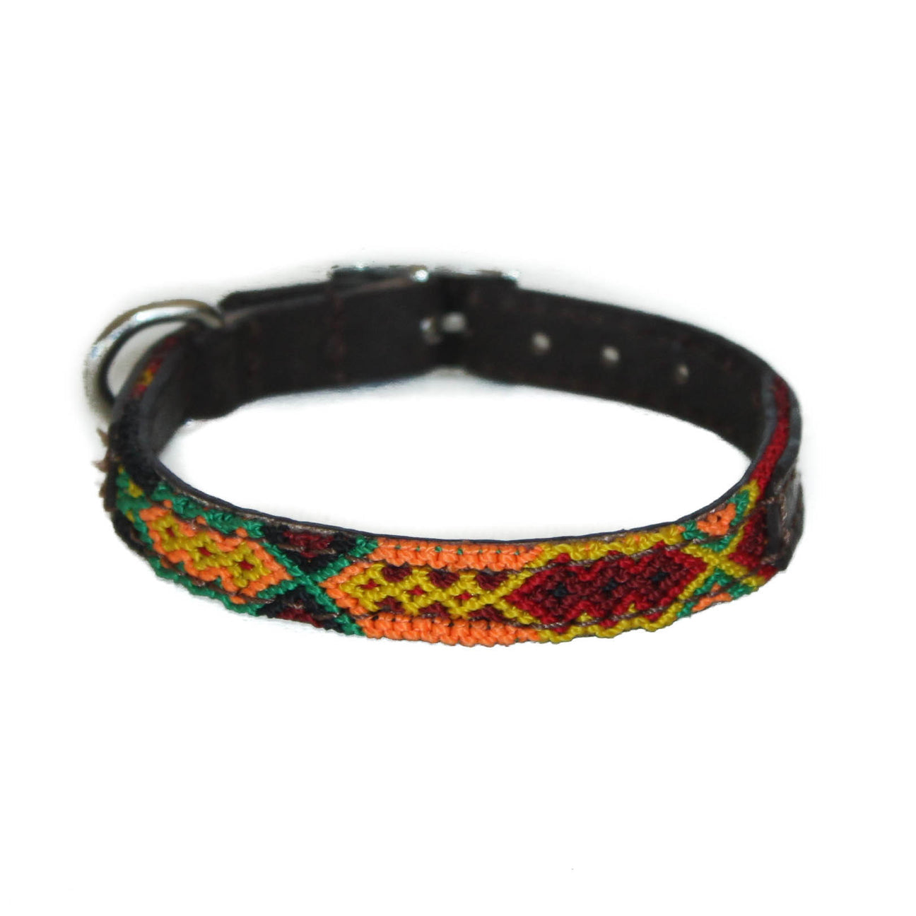 Beautifully hand-woven dog collar with leather backing and buckle. Each collar is unique, handmade with love and takes approximately 2-8 hours to create, depending on the size. This is traditionally a woven belt (band) that is re-purposed into our collars.